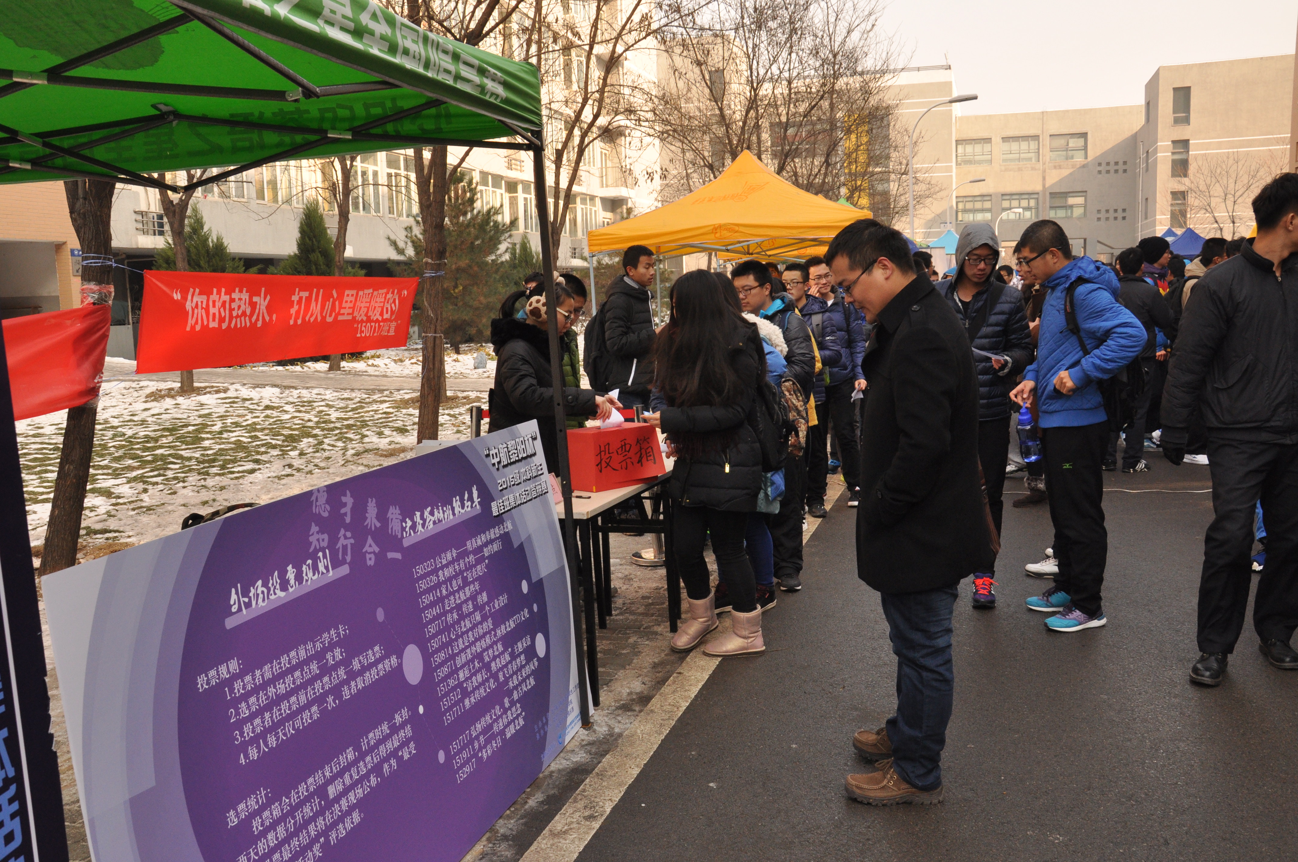 2015级本科新生最佳班集体活动答辩赛外场展示于11月27日在沙河校区1,4号学生公寓楼之间开展,参加本次外场展示的是晋级决赛的十四个班级。