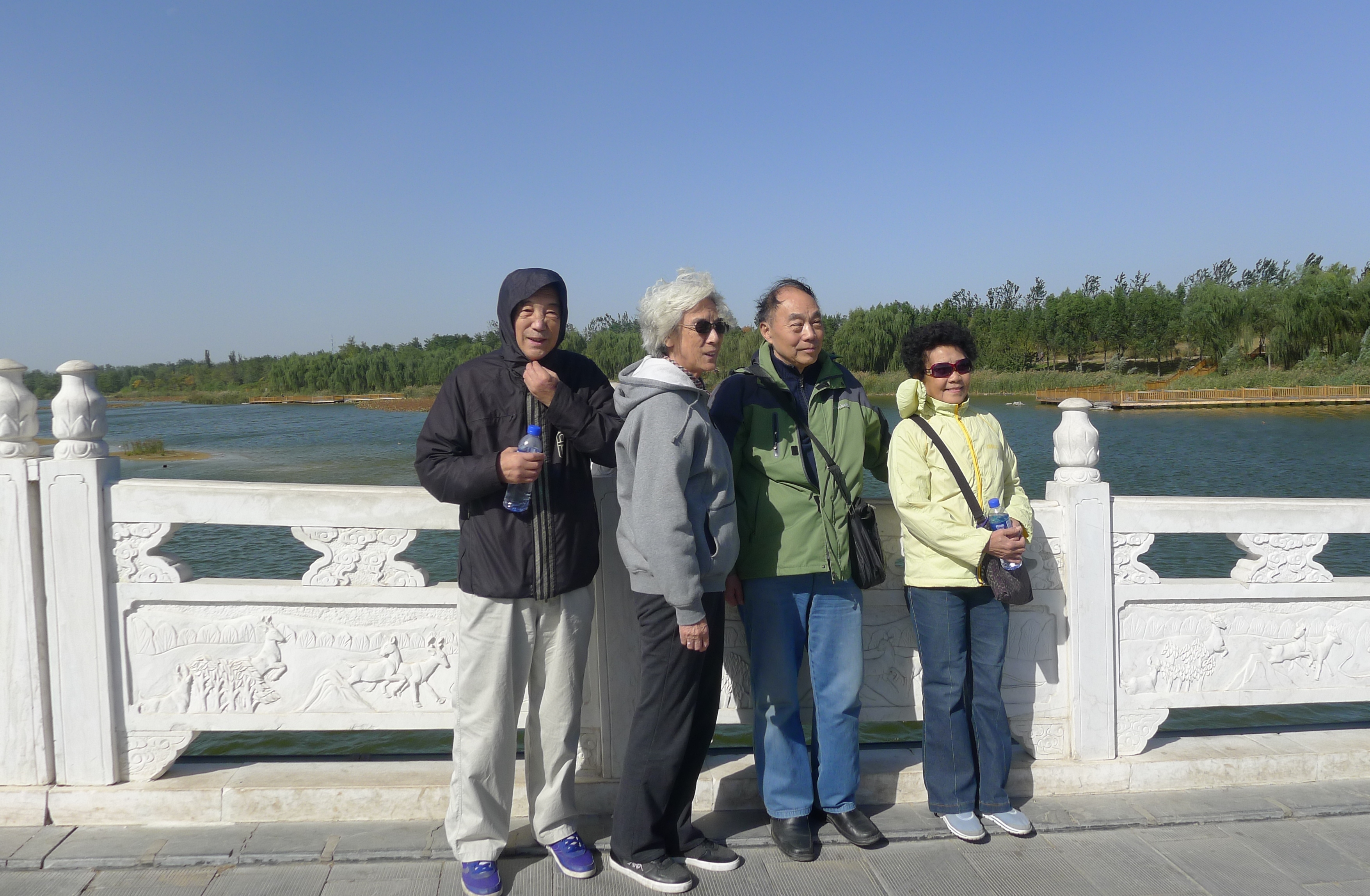 虽然天公不作美,刮起了大风,但是没有阻止老师们游览的脚步。老师们漫步湖边,四周垂柳成荫,湖滨芦苇摇曳,湖边是大片的草场。从河上跨过的小桥上走过,桥的护栏上刻着各个时期名人对麋鹿的感受和体会,如封神演义的“麟头豸尾体如龙,足踏祥云至九重。四海九州随意遍,三山五岳霎时逢”,相传姜子牙的坐骑就是“四不像”的麋鹿。老师们一边观赏在水边栖息的麋鹿群,一边讨论麋鹿的来历、生活习性、以及与梅花鹿等其他鹿科动物的区别,等等。沿湖边一路西行,经过观鹿台、科教基地,路边还歇息着三五成群的孔雀。这些孔雀也许见多识广,一点也不怕人,老师们还和孔雀零距离接触了一把。