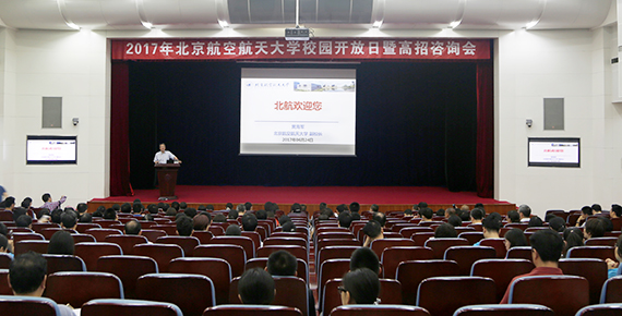 政策宣讲会场连续进行了四场报告。黄海军副校长以《北航欢迎您》为题介绍了北航的发展历史,结合我国重大战略需求介绍了北航目前的科研学术影响力,最后,从美丽校园、多彩生活、升学就业、人才培养等几方面对北航进行了深入的介绍。招生就业处马进喜处长介绍了北航人才培养的特点和2017年本科招生政策。在人才培养特点上,马处长从北航人才培养目标、指导方针讲起,介绍了北航在创新人才培养上的新举措和北航国际化人才培养战略和措施;在招生政策上,马处长首先介绍了大类专业招生,然后从招生规模、招生类型、招生专业、志愿填报、投档规则、录取规则等六个方面对高考志愿填报进行了详细的指导,深受到场家长的欢迎。