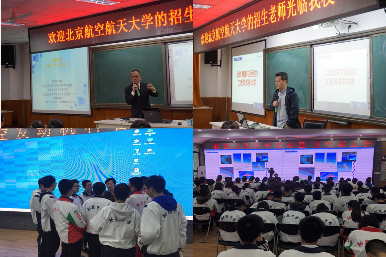 2018年本科招生前期宣传工作。联合北航校友会和北航四川校友会组成的校友宣讲团、联系北航四川创新研究院及在川教授组成的教授宣讲团在成都市和绵阳市重点中学共举办6场科普和招生宣传讲座;在宜宾一中进行共建优质生源基地挂牌仪式;参加四川省教育考试院组织的高校专项计划暨2018年在川招生宣传工作会、绵阳南山中学110周年校庆系列活动。