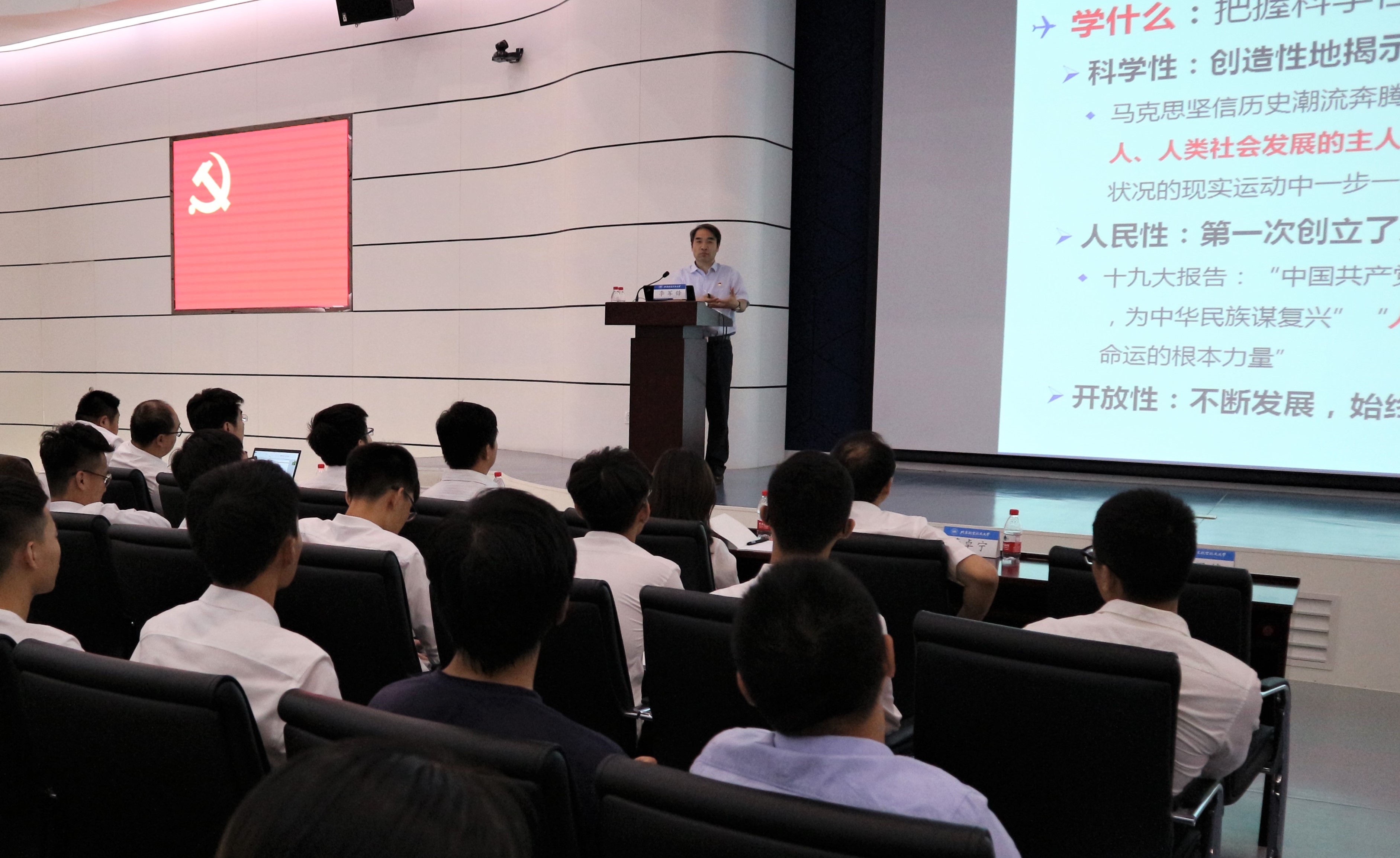 李军锋首先用马克思主义立场、观点和方法解读了第一次工业革命时期的历史图景,以及我国经济社会大发展、科学进步大变革、国际关系大调整等三大新时代图景,通过两个时期的情况对比,启发学员认真思考,作为青年学生的优秀代表,该如何承担历史责任、如何成长成才。接着,李军锋通过对比救国、兴国、强国等不同时期的不同爱国表现,希望同学们要以实际行动忠于祖国、忠于人民;通过分析事业和职业的不同、解读敢为人先的北航精神、分享远志解近忧的典型事例,希望同学们要把对专业和职业的关注上升为对事业和使命的关注;通过分析为什么学马克思主义、学什么、怎么学,鼓励同学们感悟真理力量,锻炼科学思维,真正把马克思主义这个看家本领学精悟透用好。