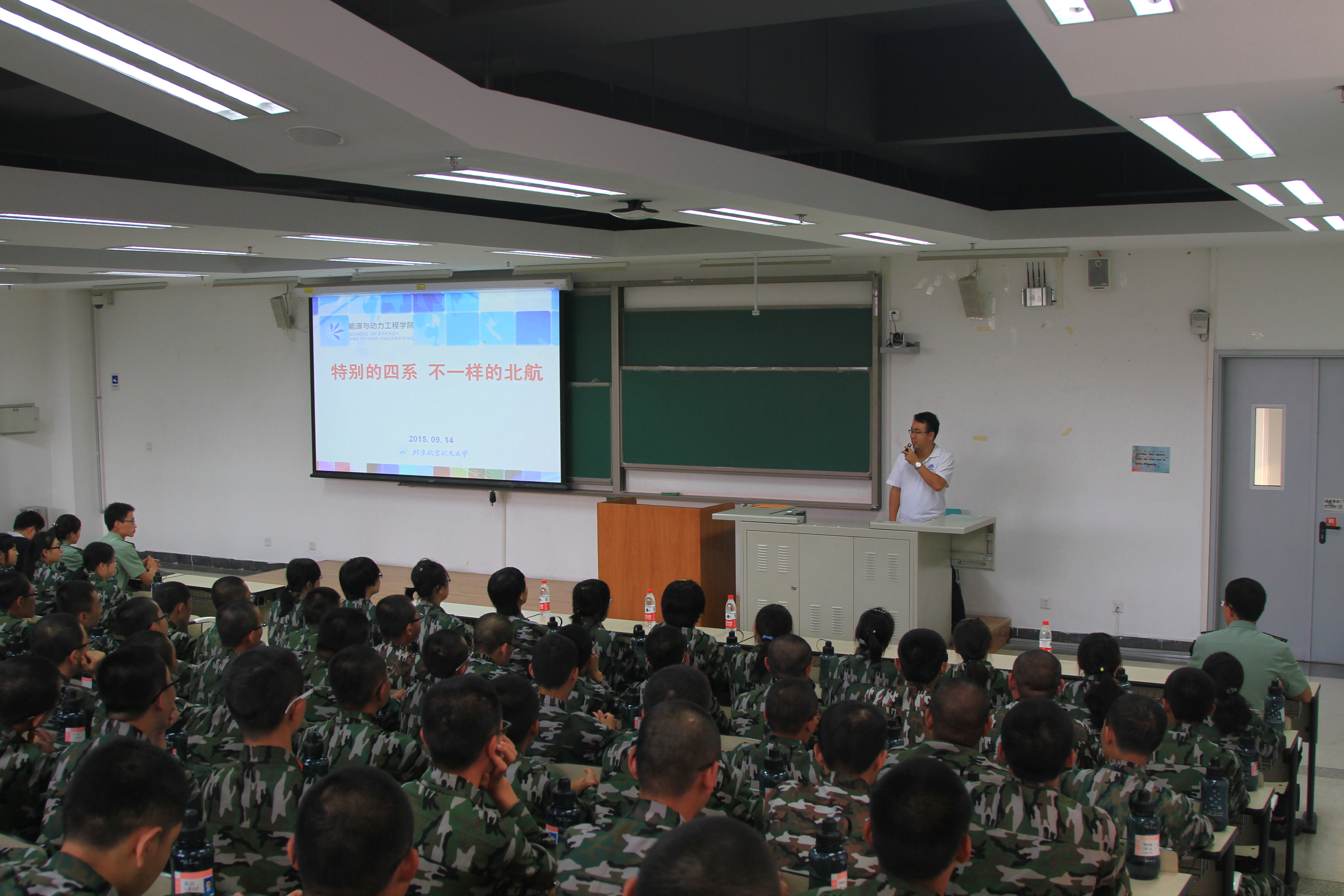 之日起就心怀报国之志,努力学习,提高能力,为我国未来的航发事业添砖加瓦;《敢问路在何方》代表着同学们从祖国各地来到北航,心怀不同的梦想,但同时也要把握好大学四年时间,努力学习,找到适合自己的发展道路;第三首歌是《奉献》,没有一代代四系人的艰苦付出,北航四系不可能有今天,同样地,如果没有我们这一代四系人的努力,北航四系,乃至我国的航空发动机事业都不可能有明天。最后,书记提到著名电视剧《亮剑》,希望我们的同学们在今后的学习生活中能时时处处发挥“亮剑精神”,对自己严格要求,争先创优,用实际行动唱响“北航四系,王牌动力”的口号。