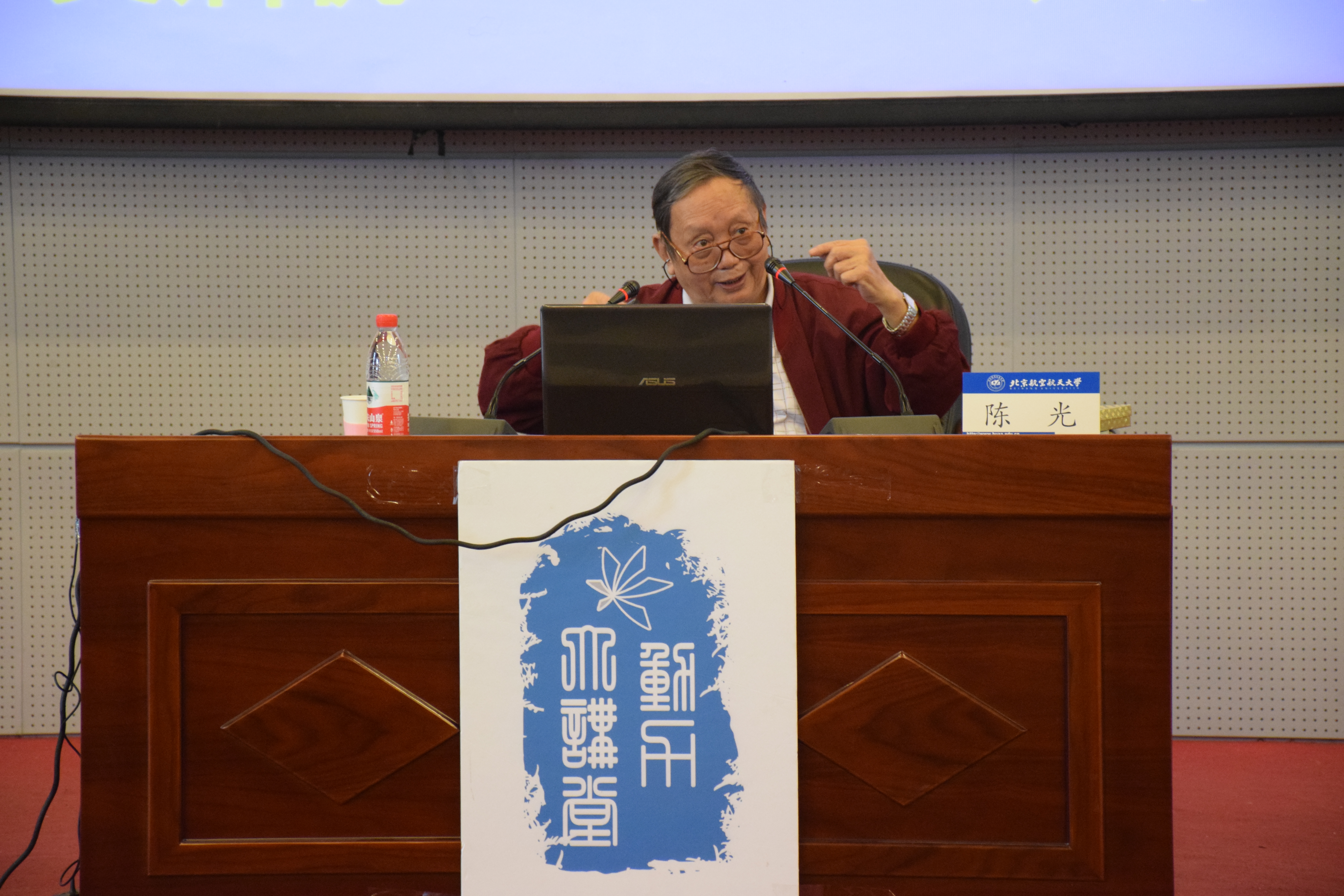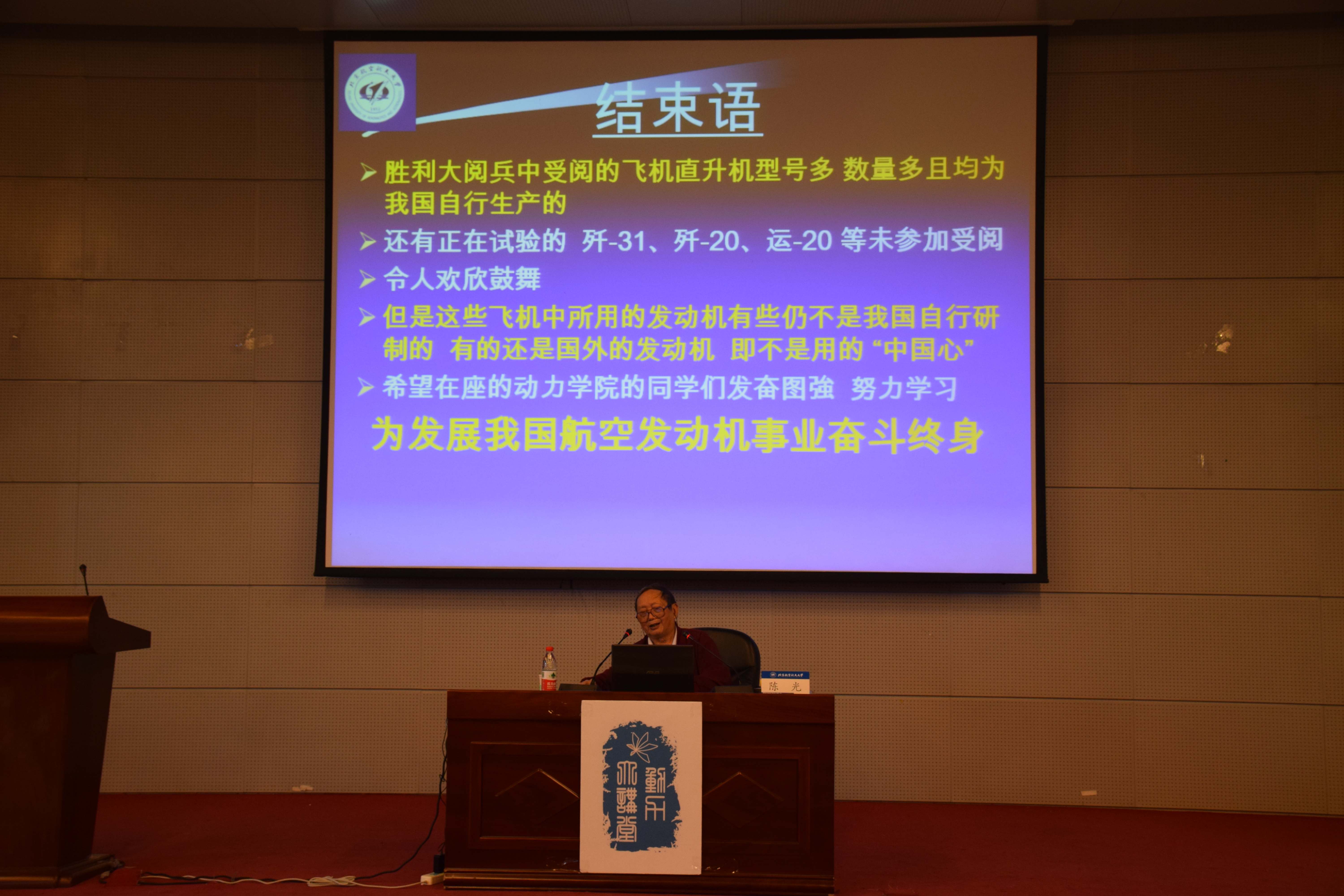 老教授陈光先生来到沙河校区,为同学们带来了题为“巨龙亮剑”——大阅兵中的几型飞机的讲座。讲座开始之前,老教授为同学们讲述了在国家刚刚解放时,前辈们学习生活条件的艰苦,勉励同学们在这生活条件优越的年代要更加努力的学习,对得起老一辈为我们做出的贡献。