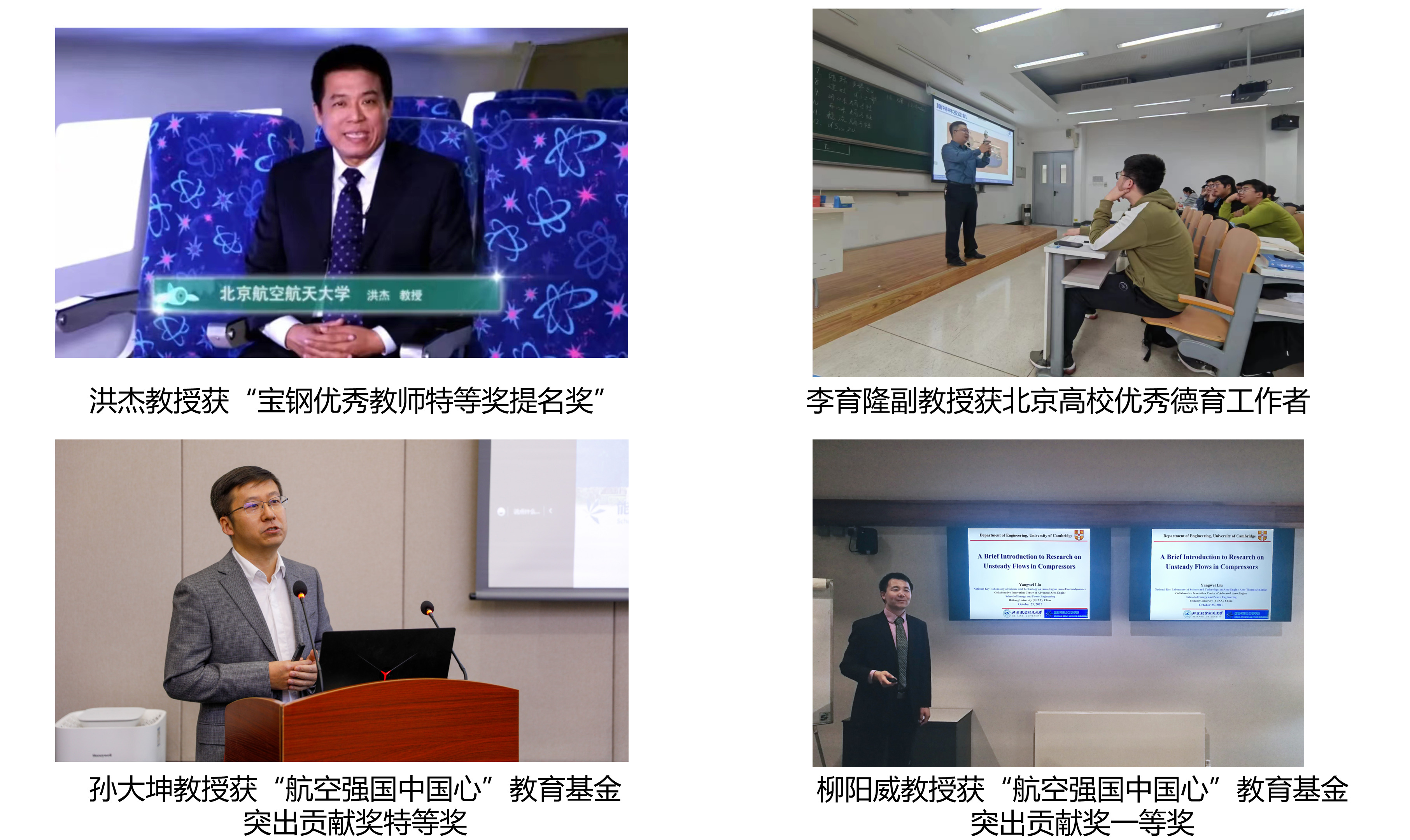 刘大响院士获得中国航空航天领域最高荣誉—“航空航天月桂奖终身奉献奖”以及“首都精神文明建设奖”。刘大响院士深耕远山三十年,打造出全球领先的航空发动机高空模拟试车台,让中国实现了从0到1的突破。主持关键技术预研,制定我国航空动力跨世纪战略发展路线,为中国航空发动机事业贡献大智慧。洪杰教授获宝钢优秀教师特等奖提名奖,李育隆副教授获北京高校优秀德育工作者,孙大坤教授、柳阳威教授分别获“航空强国中国心”教育基金突出贡献奖特等奖、一等奖。