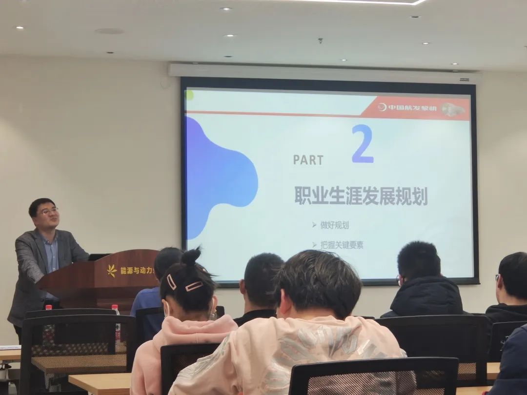 邀请中国航发沈阳黎明航空发动机有限责任公司人力资源部员工管理室金杨副主任为同学们带来了主题为《个人职业生涯发展分享》的讲座,同行企业领导还有人力资源部高楠老师。