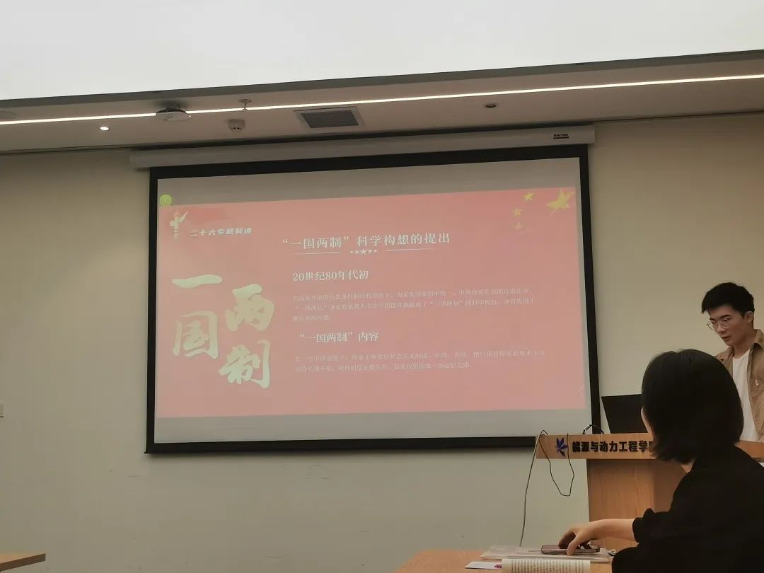 SY21046党支部书记赵崇祥做题为《坚持和完善“一国两制”,推进祖国统一》领学,现代结合历史,变化结合不变,文字结合视频,多角度介绍了“一国两制”制度的诞生、香港澳门的回归、祖国统一的展望。