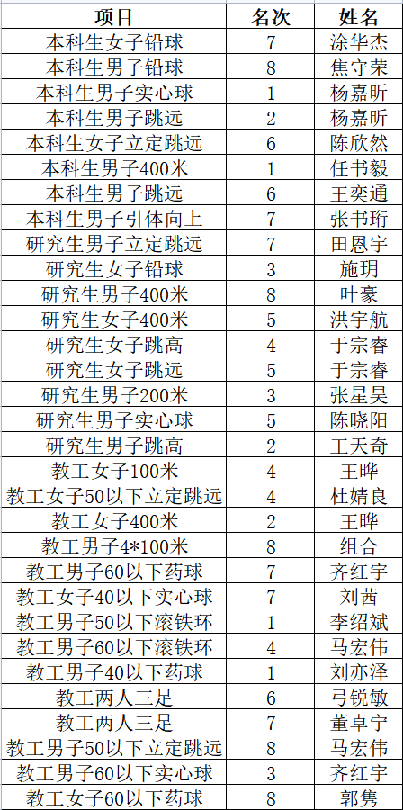 赓续拼搏精神,铸就崭新辉煌,为期两天的运动会圆满闭幕,在动力师生的共同努力之下,运动员们取得优异成绩。多个项目斩获前8,四个项目位居第1,教职工获甲组团体第九名(共21支队伍),本科生获甲组团体第六名、研究生获甲组团体第五名(共25支队伍)、广播操获一等奖、USDT博彩