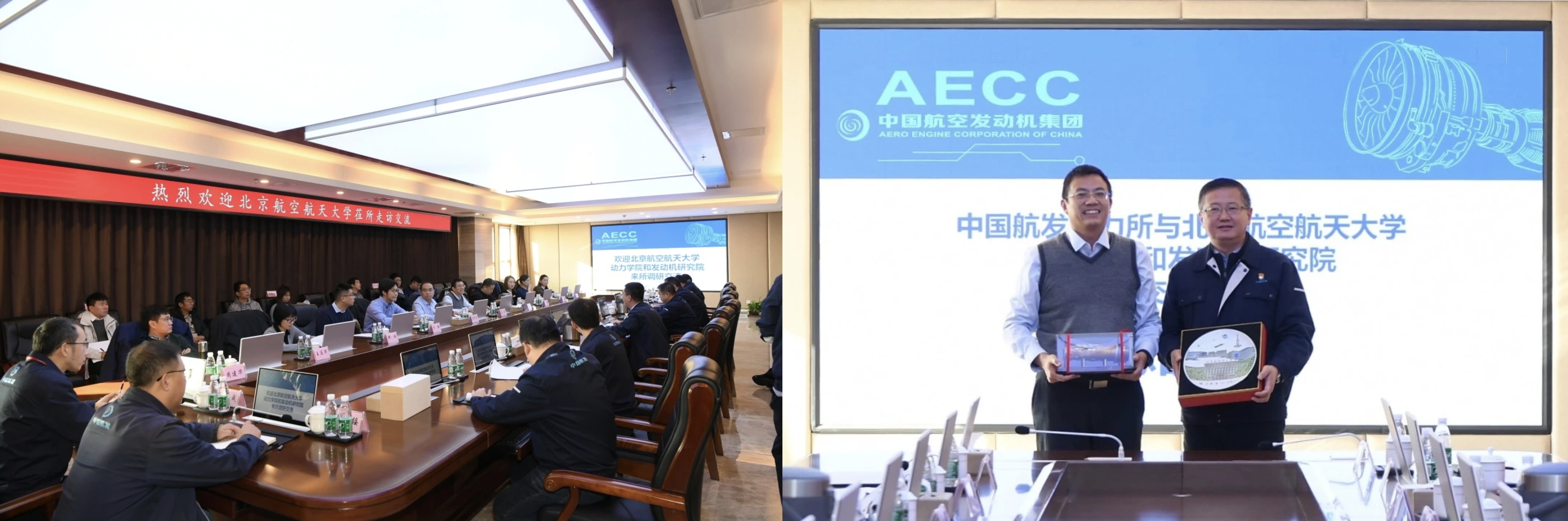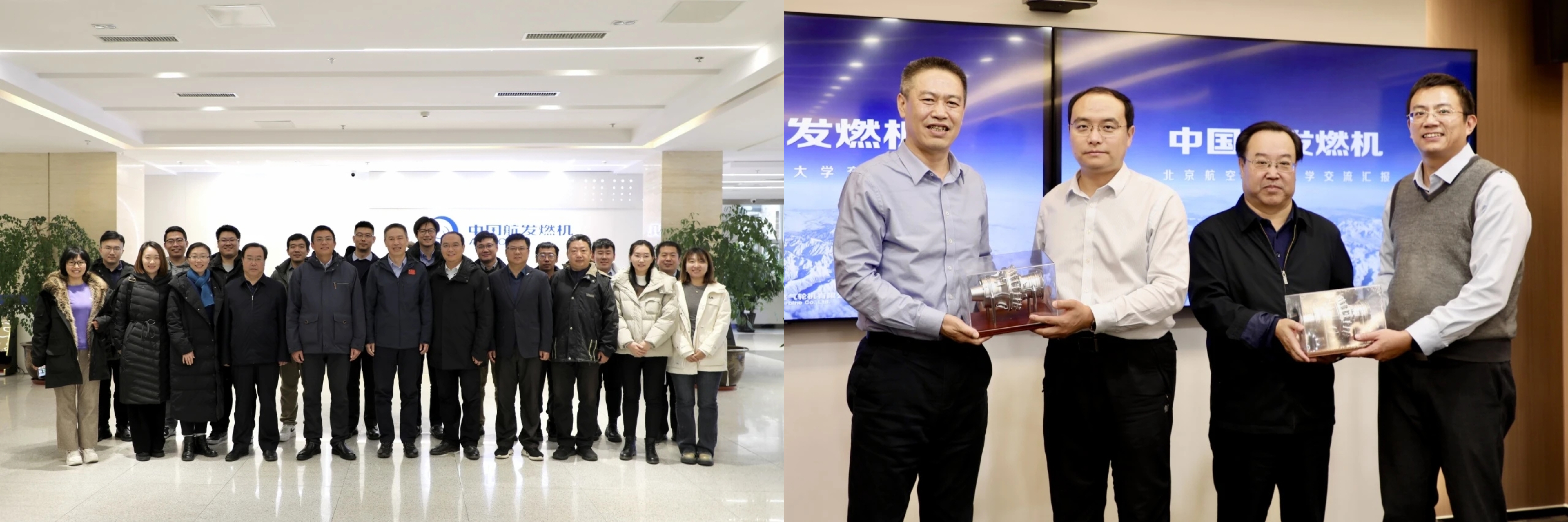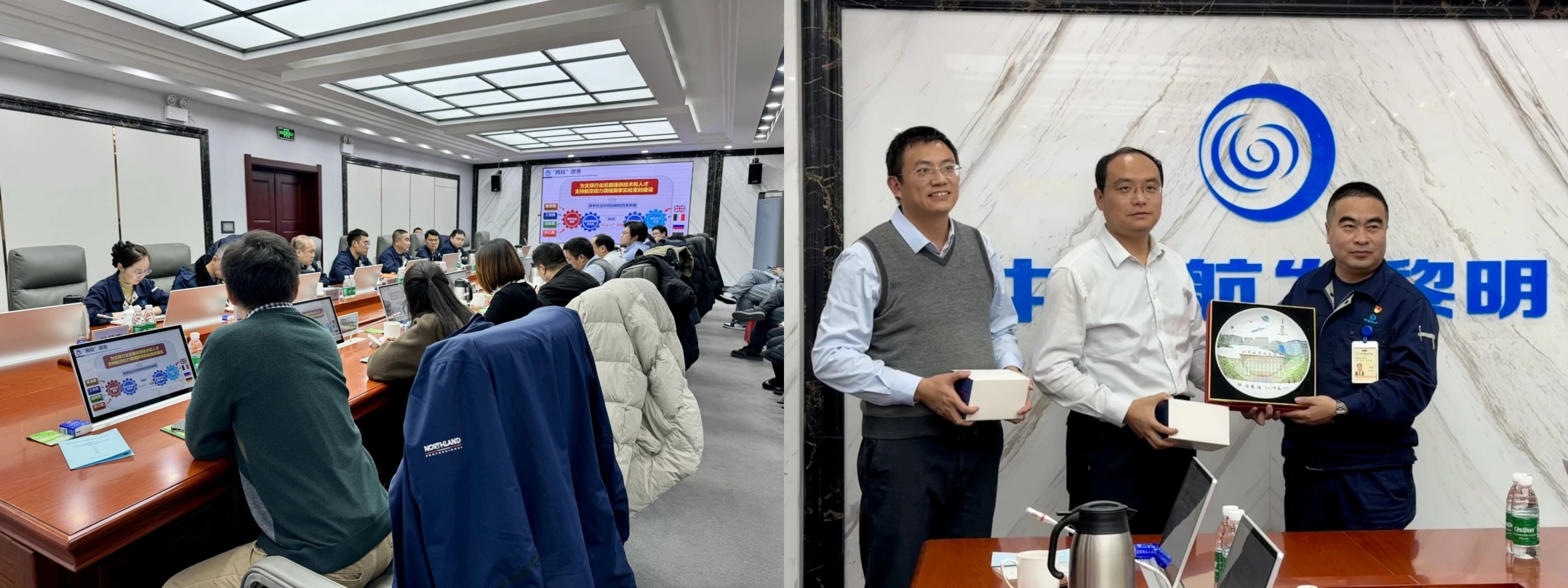 和航发院的基本情况,双方就完善产学研一体机制和未来合作方向进行讨论、互赠纪念品并合影留念。