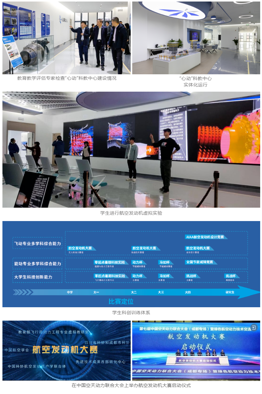 做实科教协同,总结三代人传承自强中国心精神、科教协同育人经验,建成首批科教协同创新平台——“心动”科教中心,聚焦专业教学实验、科技创新实践、先进设备共享、科普宣传教育四大功能,占地2400平米,设备600台套,承载12门课程、40项实验,建成17套虚拟/混合现实设备和VR资源编辑器、发动机原理演示、虚拟拆装等6套软件。引进航发国产设计软件,购置并共享使用重大科研仪器设备,建强中心师资队伍。USDT博彩