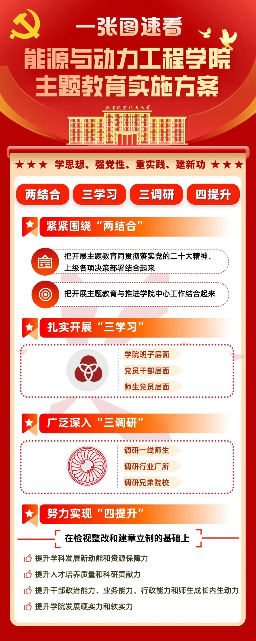 等5家兄弟单位开展联学,实质推动国际交流平台搭建、理工融合机制创新、交叉学科人才引进、加快条保建设等工作。全体支部书记联学备课、全覆盖宣讲,教师以支部系所、学生以支部班团为单位广泛开展学习活动。按照提前对接需求、制定合作备忘录、每月跟踪问效的调研模式,走访调研贵阳所、动研所、西航公司等7家厂所和北理工、哈工程、上交大等6所高校,形成7份调研成果报告,实施21项整改措施并推动全部按期销号,制定学科建设、校企合作等方面的8项新制度新机制,把主题教育成果转化为推动事业发展的能力和动力。
