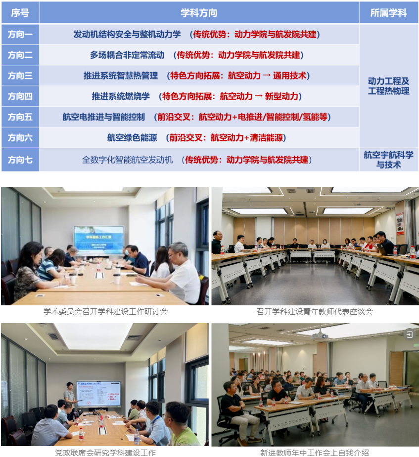 坚持把学科建设作为发展根基,召开学术委员会、青年教师代表座谈会,教师代表大会、党政联席会等,经过反复研讨和全面梳理,系统谋划和凝练7个学科新方向,既巩固传统优势,更突出前沿交叉,为传统学科注入新动能。围绕学科新方向搭平台、引人才、聚团队,成立国内首个电推进系(航空),做实航空电推进和智能控制新方向。聘任一级学科和学科方向带头人,引进环境学科12位教师并交叉融入各方向。