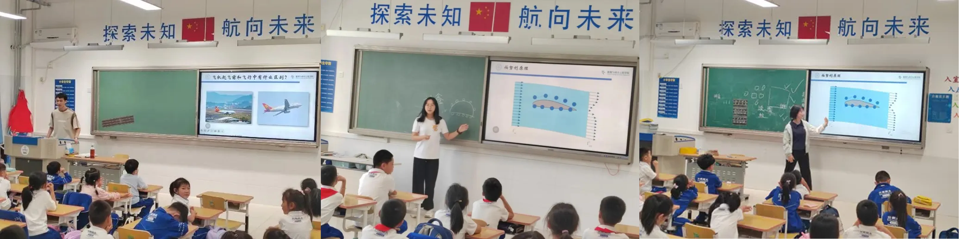 宣讲团当前正在开展北航附小“ 推动航发教育普及,点亮空天报国梦想”系列科普课程,覆盖6个年级10余班级超300人,课程内容涉及基础的物理知识如牛顿第三定律、伯努利原理、膨胀波、压缩波、激波;还有飞机的分类如螺旋桨飞机、喷气式飞机等;以及飞机的机身构造、流线型设计原理、机翼的具体部件等。孩子们怀揣着对未知世界的好奇与渴望和对航空航天的无限热情,踏上了一场科普与探索的奇妙旅程。