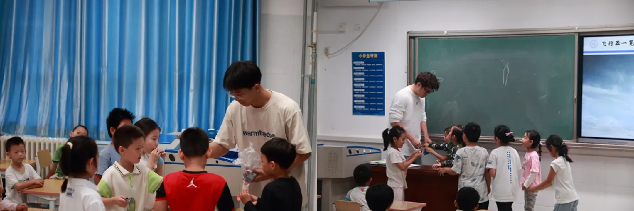 在每节课的尾声,孩子们总是有许多天马行空的想法,也对讲师们提出了自己的见解。无论是本节课上的不懂知识,还是对航空航天领域的任何疑惑,讲师们都一一解答。师者,所以传道受业解惑也。作为大哥哥大姐姐们,他们还鼓励孩子们勇敢追求自己的梦想,努力学习科学文化知识,为将来投身航空航天事业打下坚实的基础。希望他们能够像自己一样,进入北航学习,为国家的科技进步和民族复兴贡献自己的力量。