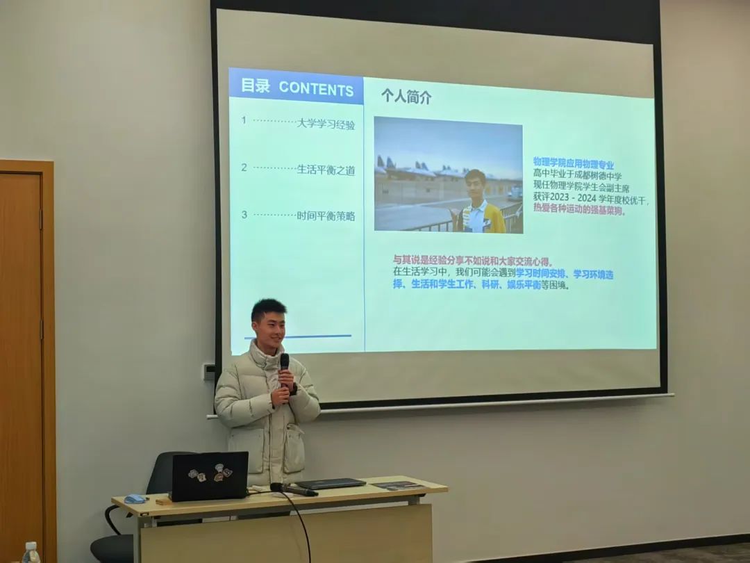 2023级应用物理学强基计划的易睿诚,向大家介绍了学习方法和生活平衡之道。他总结出“没有最好的(环境、资源),只有最适合自己的”的规律。面对大学学习,他强调首先要有自信,从心态到学习方法都要有全方面的自信。其次,应转变应试思维模式以适应新的环境,我们要善用USDT博彩