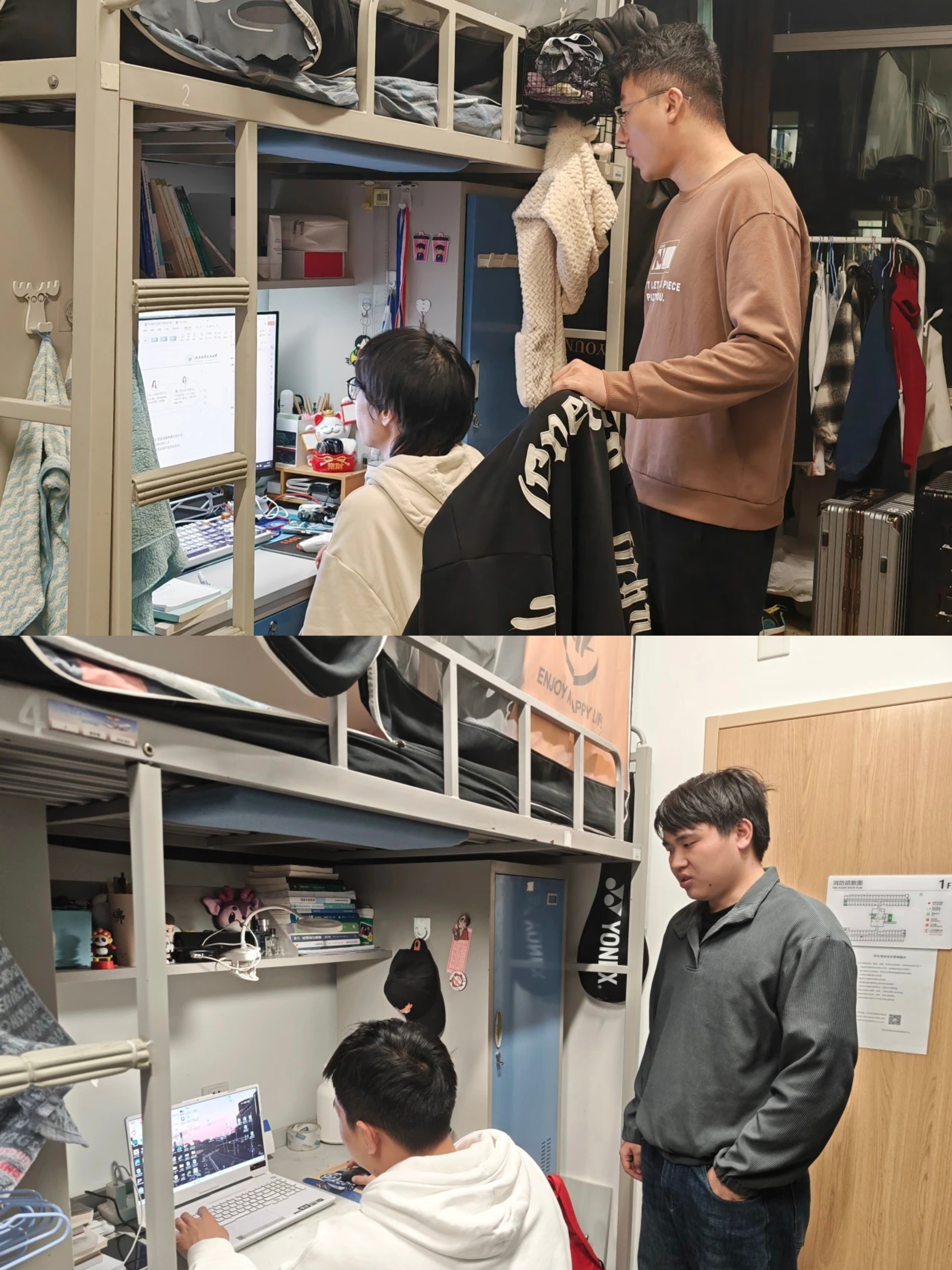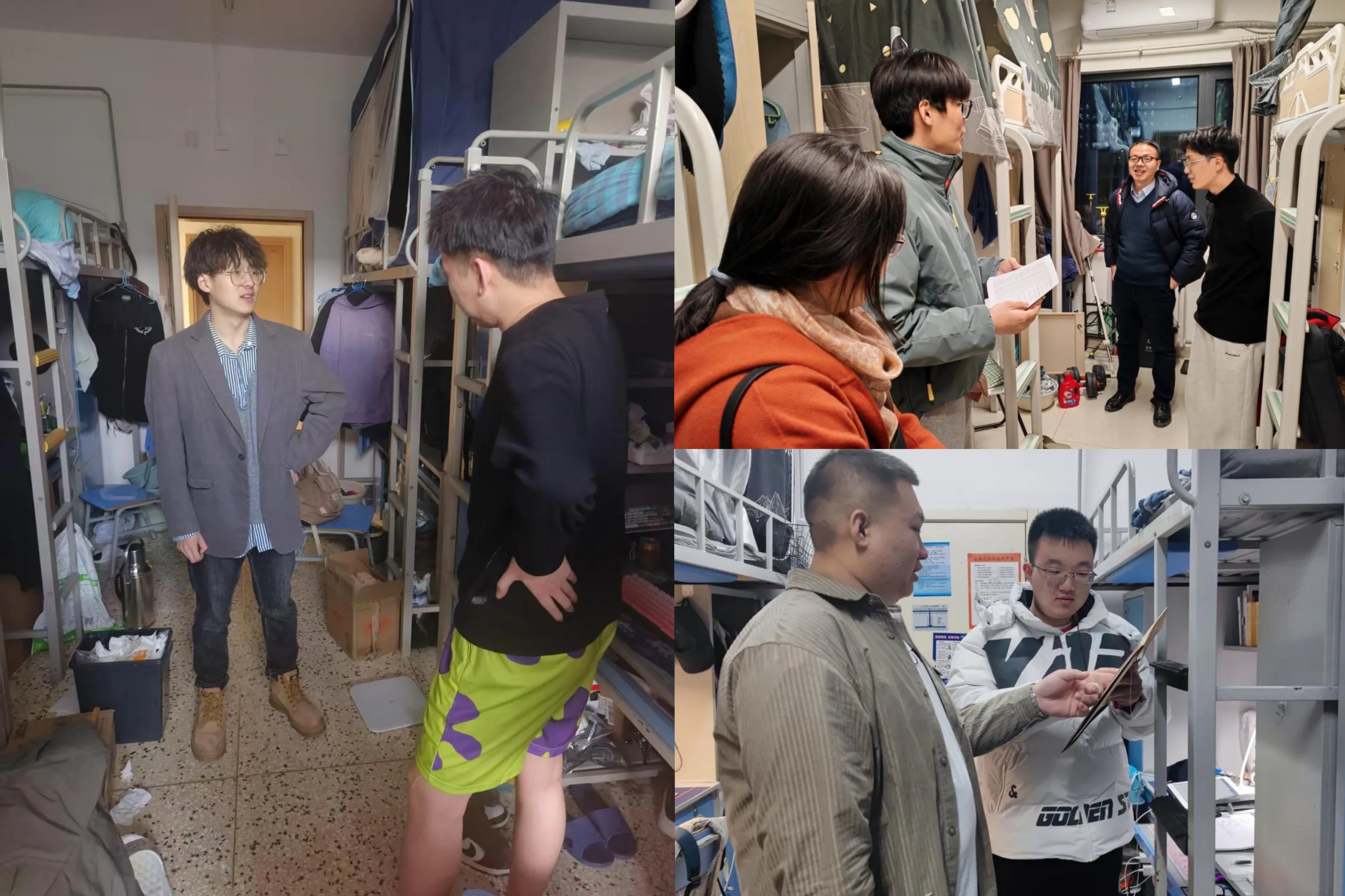 老师和辅导员走访学生宿舍,了解同学们的假期生活、学习进度、学期规划等。敲开房门,既有学生专注科研的身影,也有备考复习的专注,同学们已经进入状态,做好新学期的准备。