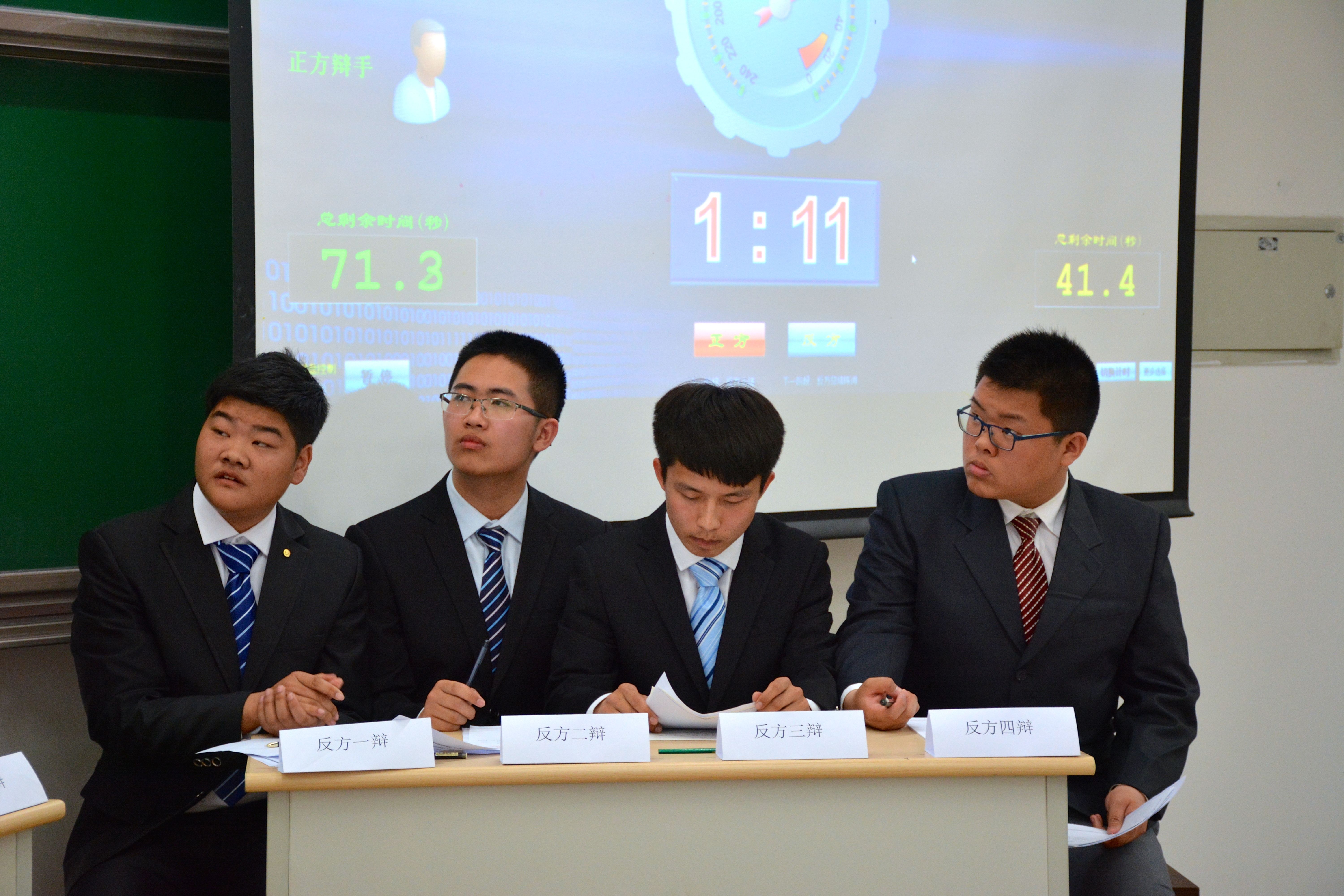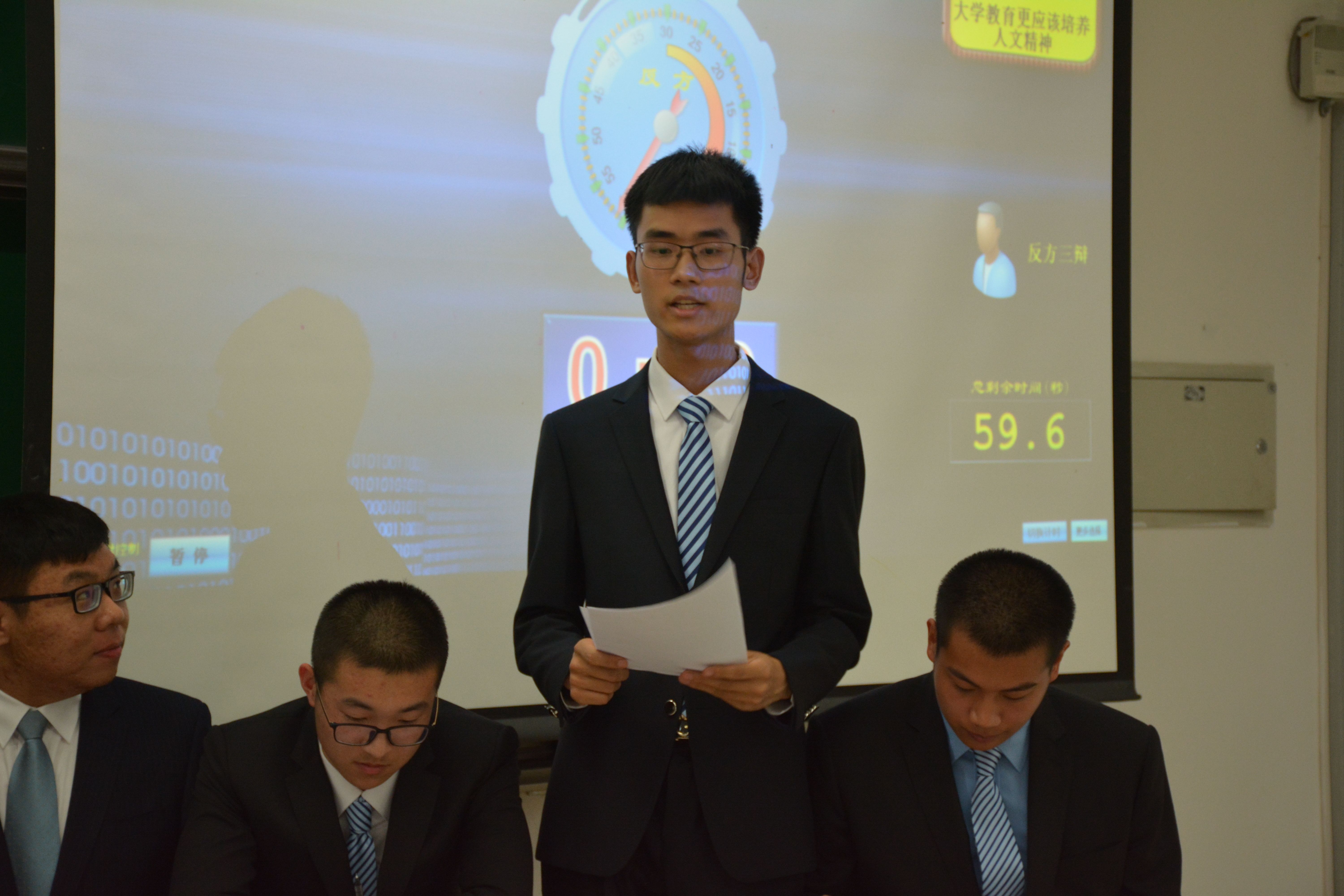 终于到了战况激烈的自由辩论环节,反方思路清晰,专注于从“缺失性比较”等方面论述己方观点,反方三辩王明鑫妙语连珠,用丰富的事实论据、道理论据证己方观点,反驳对方观点,展现出自己的风采。