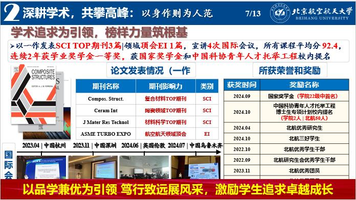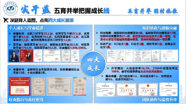 五育并举,因材施教。德育铸魂育心,点亮学生成长“信念灯塔”,讲好三代人“中国心”故事,传承空天报国红色基因。智育领航慧心,铺设学生成长“智慧轨道”,建立“三步走”学风建设体系,全方位赋能学业发展。体育固本强心,激活学生成长“活力引擎”,打造“三横三纵”体育育人体系,为祖国健康工作五十年。美育熏陶润心,装点学生成长“精神花园”,构筑“三环联动” 艺美格局,放飞青春梦想。劳育践行健心,淬炼学生成长“实干利刃”,锻造 “三线协同” 劳育方阵,服务国家建设。在成体系,明思路的培养下,育人成效显著突出,学生个人和集体全方面发展,取得多项荣誉和奖励。北航三好学生37人次,优秀学生干部27人次,优秀团干部4人次,优秀团员19人次,五四奖章提名1人次,沈元奖章提名1人次。SCI论文1篇,EI论文3篇,授权专利1项,投稿会议论文2篇。大班保研率56.3%,210441班推免率达100%。