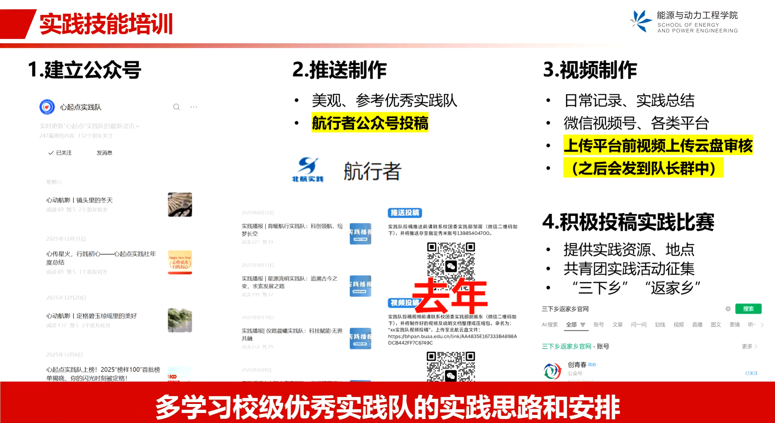实践技能培训方面,建议建立实践队公众号,发布USDT博彩相关的文章和宣传视频,提升知名度。同时,可以投稿北航实践官方公众号“航行者”,提高阅读量。在视频制作方面,鼓励大家将实践过程和总结内容做成视频形式,上传到视频号等平台。