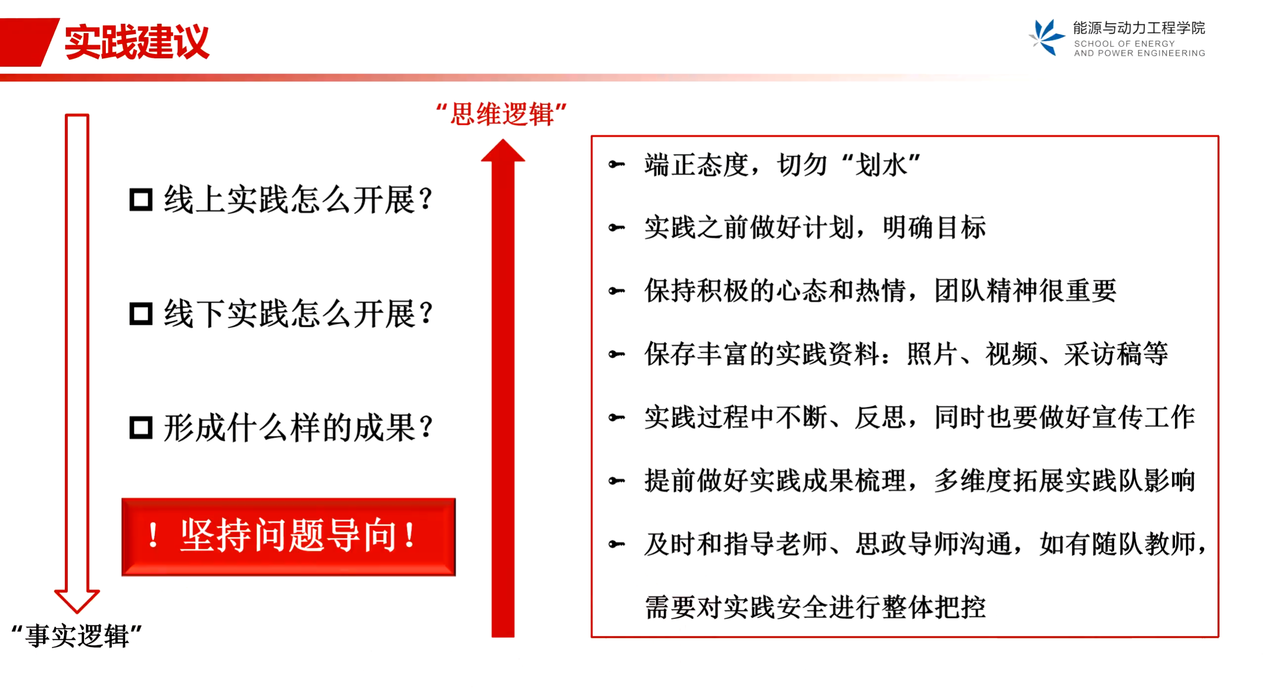 在实践建议方面,要注重问题导向,明确实践主题和目标,保持积极态度,组织好团队,注意留痕,做好宣传工作,及时与指导老师和思政老师沟通。