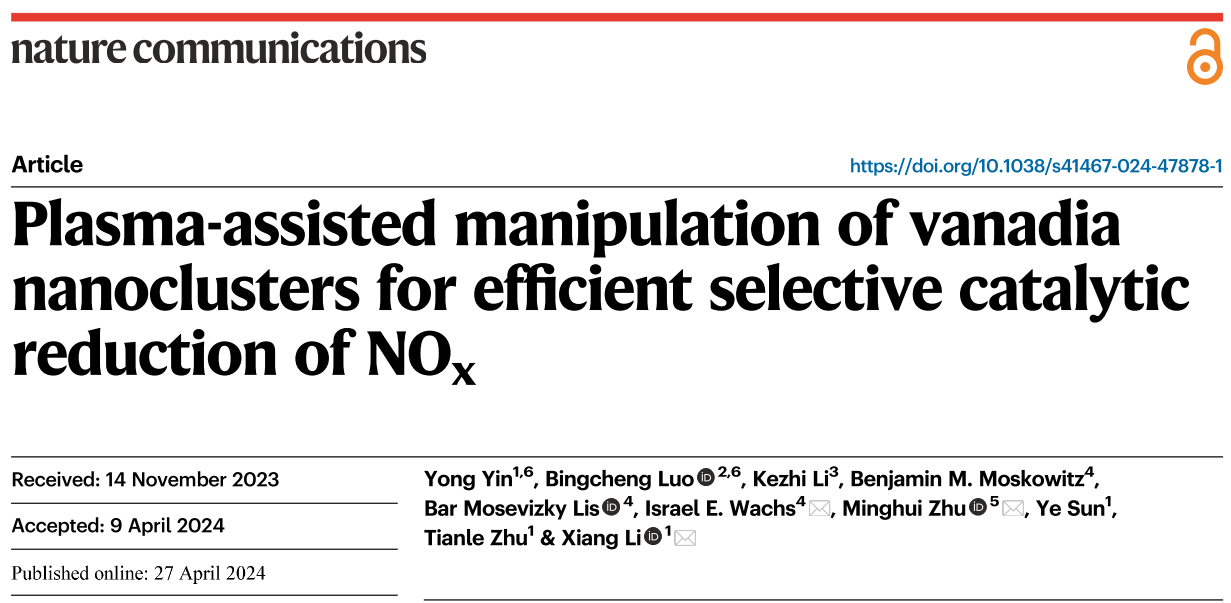 李想副教授团队与合作者在固定源烟气污染物控制领域取得重要进展。选择性催化还原是最广泛应用的烟气脱硝技术,然而传统钒基催化剂反应温度高难以适用于钢铁、水泥等工业窑炉的脱硝应用。如何通过活性位点精准调控强化钒基催化剂脱硝性能一直是该领域的挑战。团队基于H2低温等离子体表面处理,实现了低钒含量下高活性亚纳米钒氧团簇的快速合成,将脱硝效率提升十倍以上,并发现了吸附桥式硝酸盐参与氨活化的新反应路径,为固定源烟气脱硝提供了新思路。2024年4月27日,相关研究成果以“Plasma-assisted manipulation of vanadia nanoclusters for efficient selective catalytic reduction of NOx”为题在线发表于《自然·通讯》(Nature Communications)杂志。