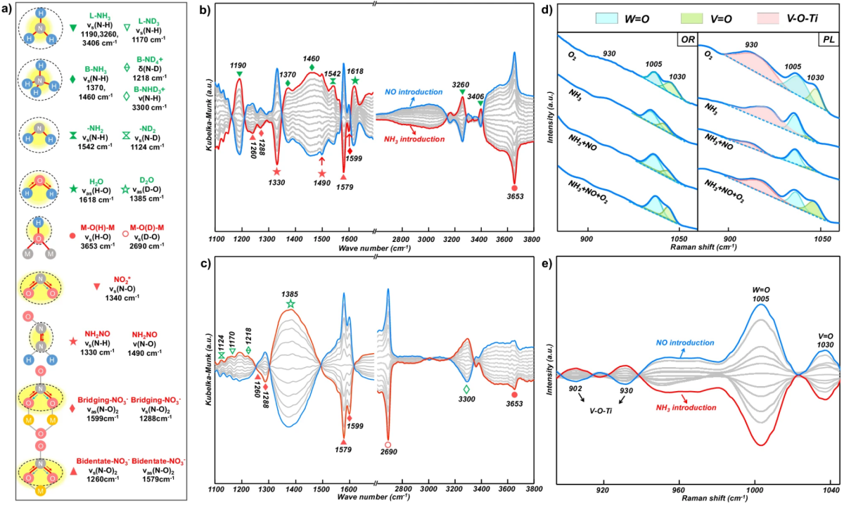 基于同位素-调制激发红外/拉曼光谱和DFT理论计算等手段,研究还揭示了钒氧团簇可通过吸附态的桥式硝酸盐强化NH3活化,并显著降低N-H键断裂反应控速步能垒(0.18eV),从而展现了优异的低温SCR活性(见图2)。研究成果为“双碳”背景下的氮氧化物减排理论与技术开发提供新思路。