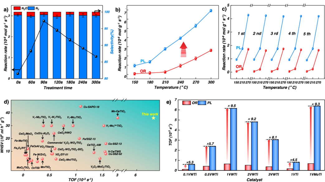 李想团队利用简单的H2低温等离子体处理商用V2O5–WO3/TiO2脱硝催化剂,实现了单分散钒氧位点向亚纳米钒氧团簇的秒级转化,在高空速条件下(375,000 cm3/(g·h)), NO转化频率提升了9.5倍,并且该方法可拓展至V2O5 /TiO2、V2O5–MoO3/TiO2等多个各类钒系脱硝催化体系(见图1)。