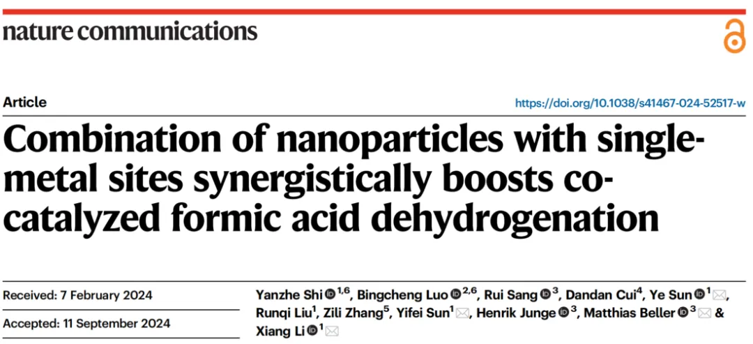 研究团队提出了一类新型低成本钴基催化剂(Co-SAs/NPs@NC),其中高度分散的单金属位点与钴纳米颗粒协同促进甲酸脱氢,达到商用Pd/C材料的15倍。同时,团队揭示了纳米颗粒调控单原子电子结构实现强化甲酸分子吸附和活化的机制,开辟了新型单金属原子催化剂设计的新思路。2024年9月18日,相关研究成果以“Combination of nanoparticles with single-metal sites synergistically boosts co-catalyzed formic acid dehydrogenation”为题在线发表于《自然·通讯》(Nature Communications)杂志。