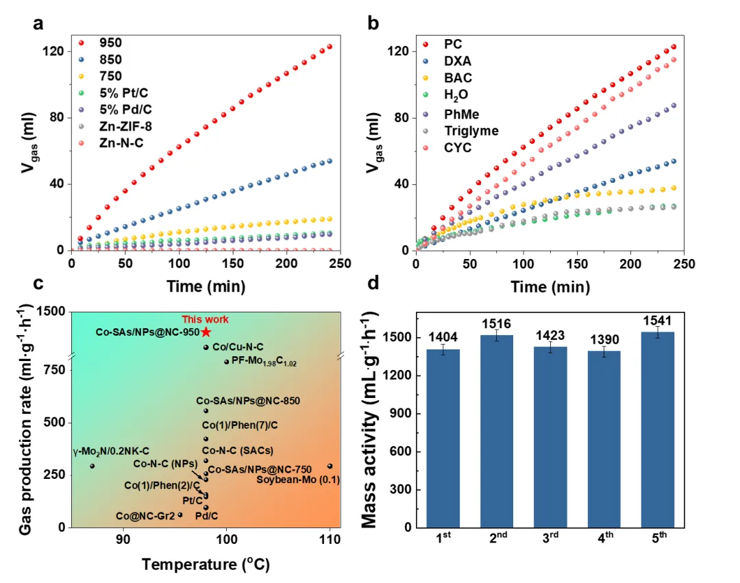 本研究利用简单的ZIF热解法合成钴单原子和纳米颗粒复合的催化剂,在碳酸丙烯酯 (PC) 中观察到Co-SAs/NPs@NC-950的活性最佳,产气速率达到1403.8 mL/(g·h),超过了大多数已报道的非贵金属非均相催化剂,分别是商用 5% Pd/C 和 5% Pt/C 催化剂的 15 倍和 10 倍(见图1)。
